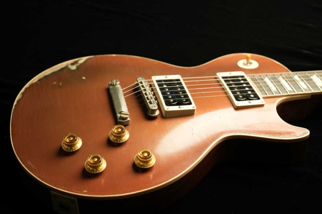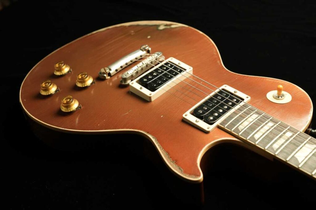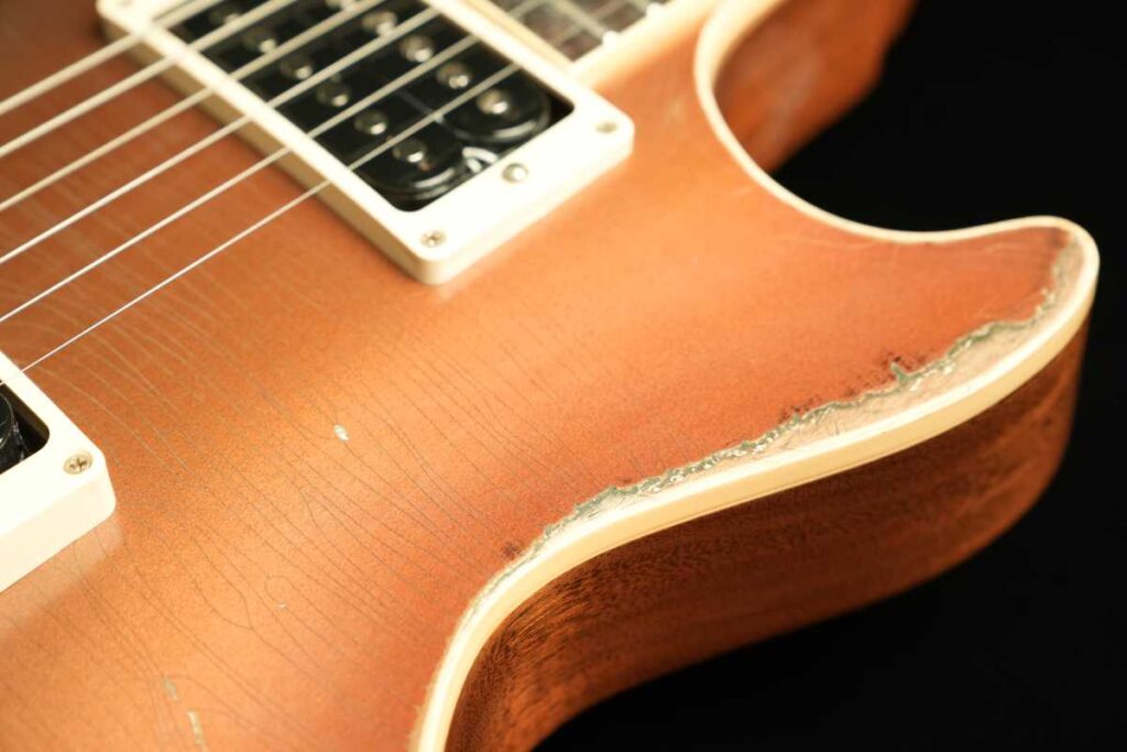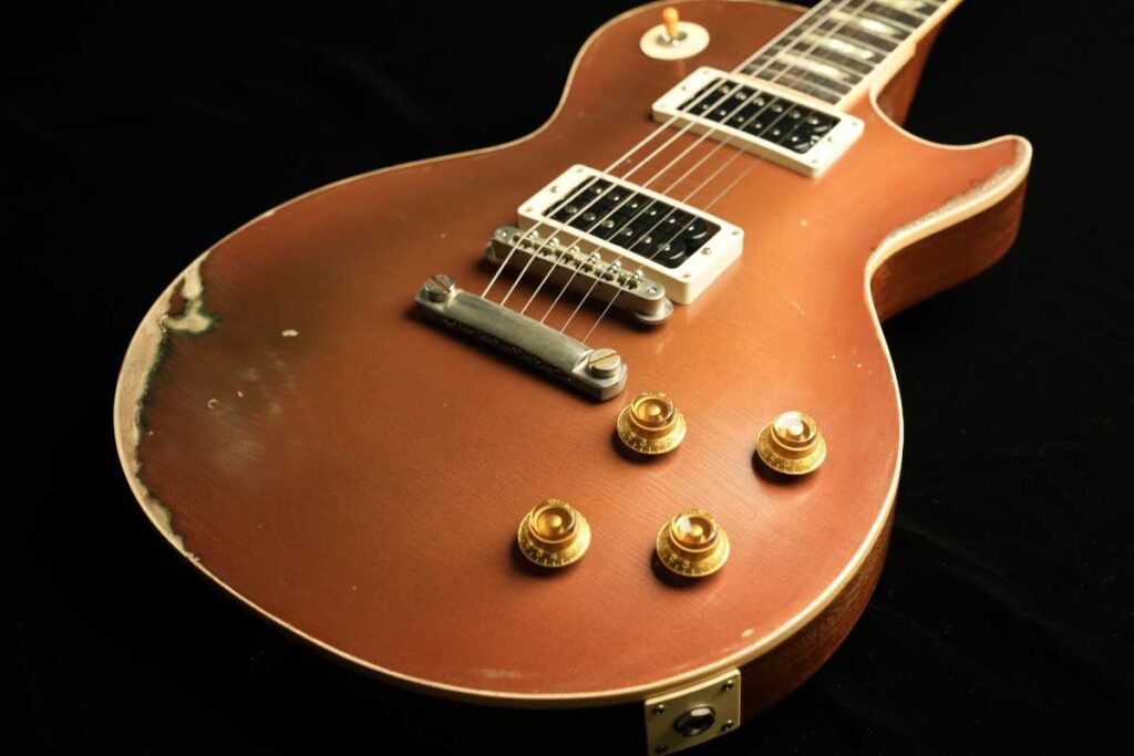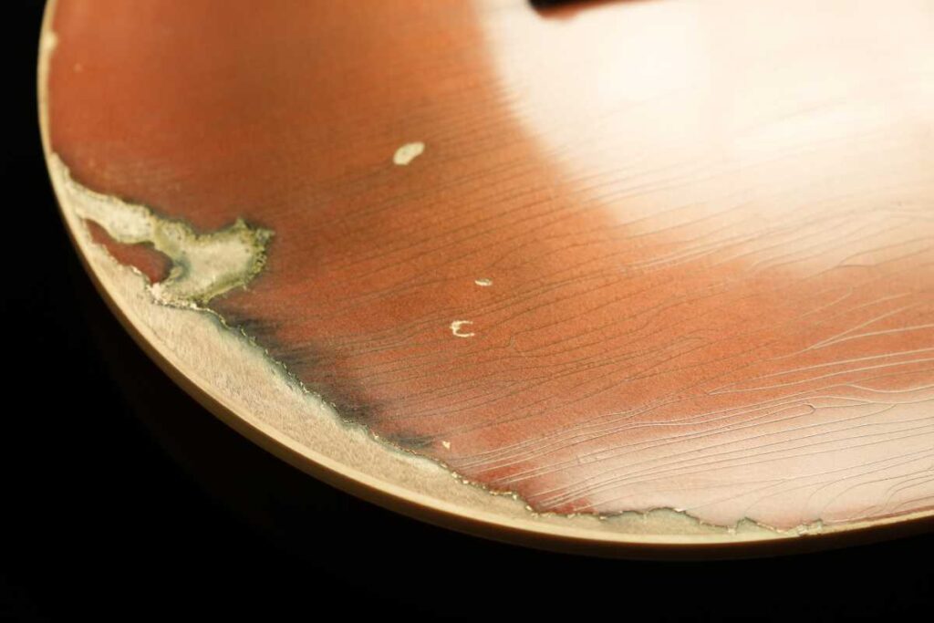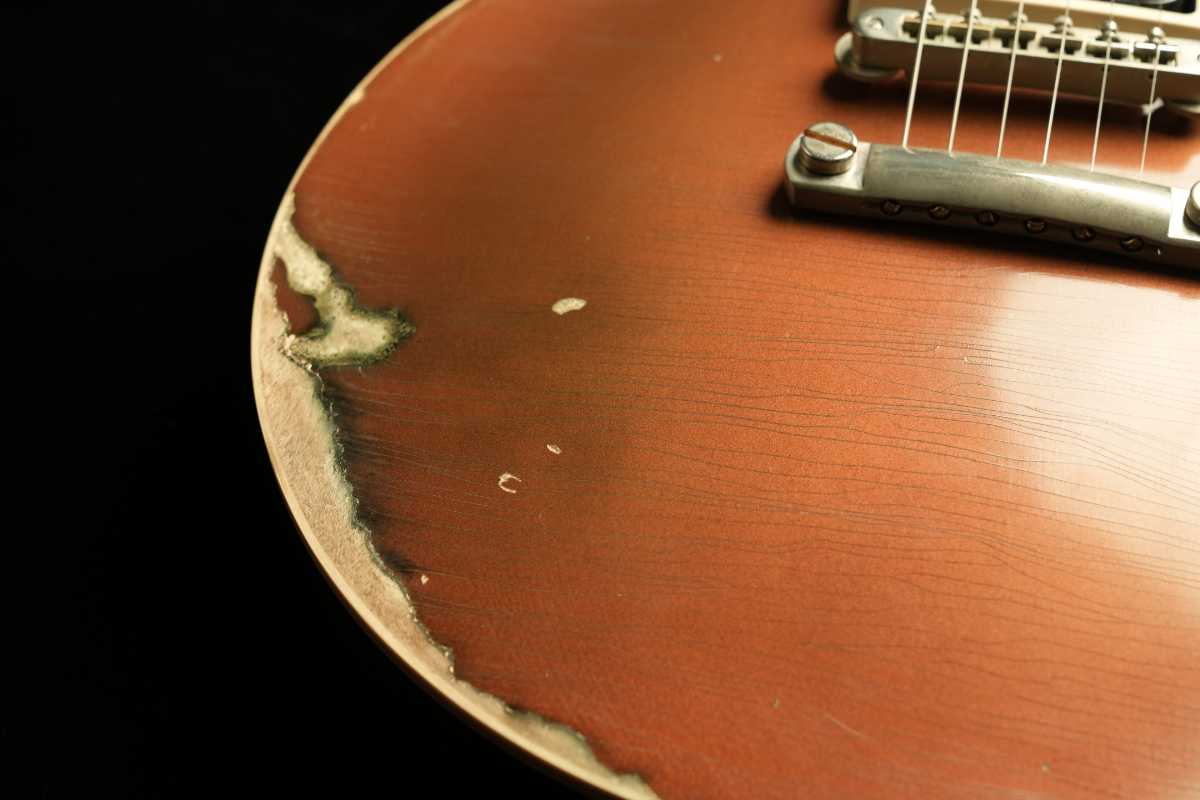 そして、ヴィンテージGoldtopの「金属の奥行き」は、単なる金色塗料ではなく、金属粉(一般にbronze/bronzing powderと呼ばれるもの)をニトロ系クリアに混ぜた層で生まれます。さらに、クリアが摩耗して金属粉が露出すると酸化が進み、緑に転ぶ個体がある——これが“緑青が出るGoldtopの根っこです。Premier Guitar
