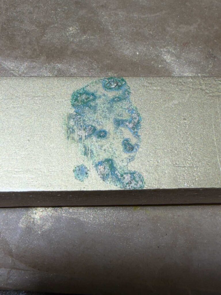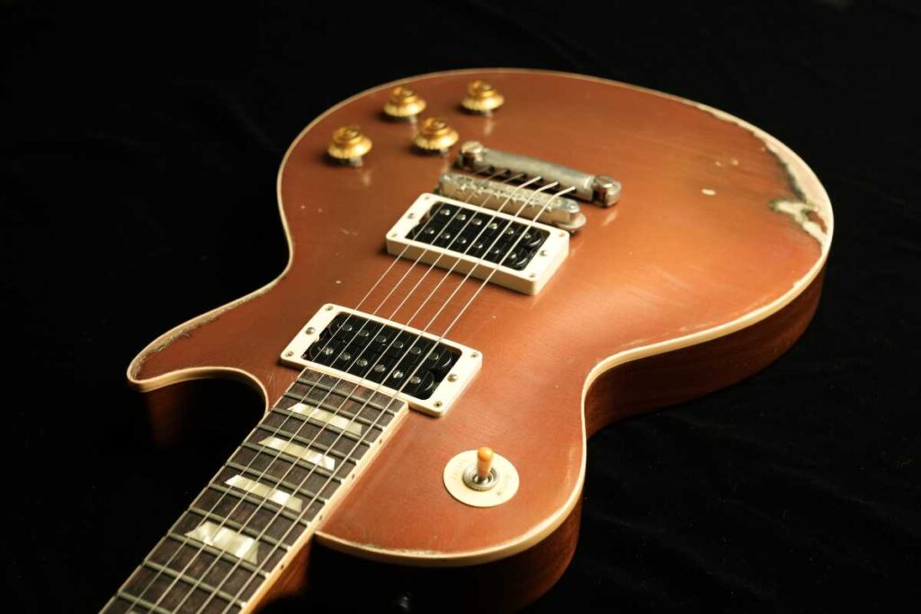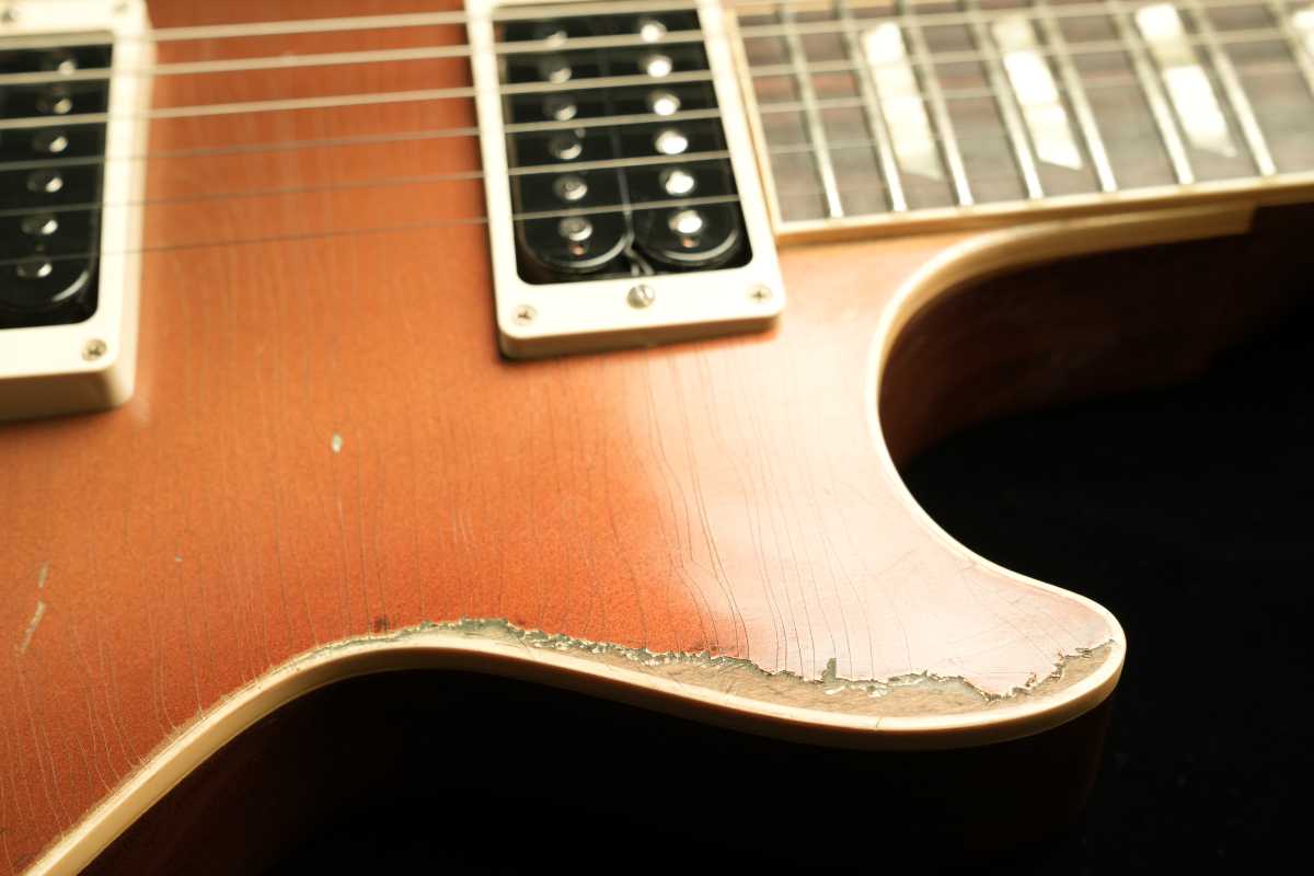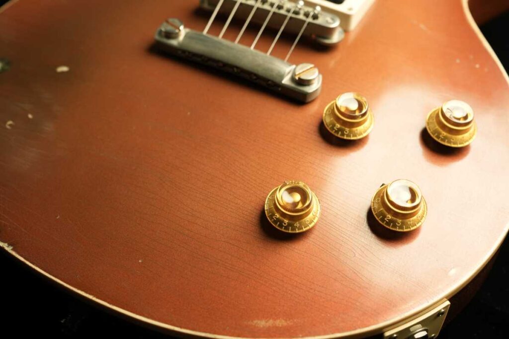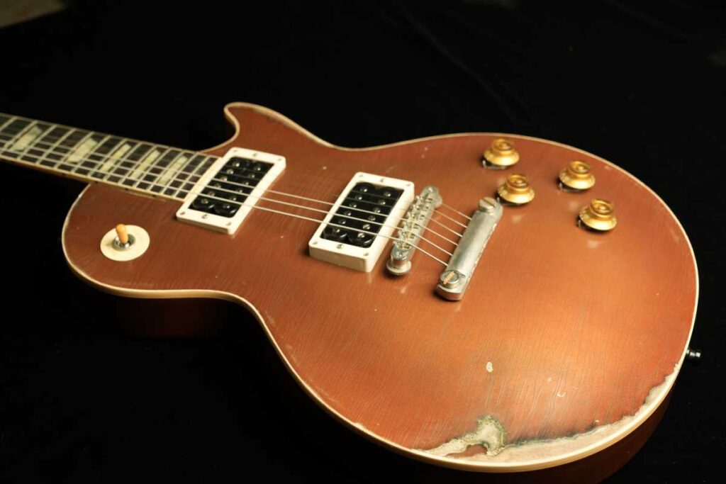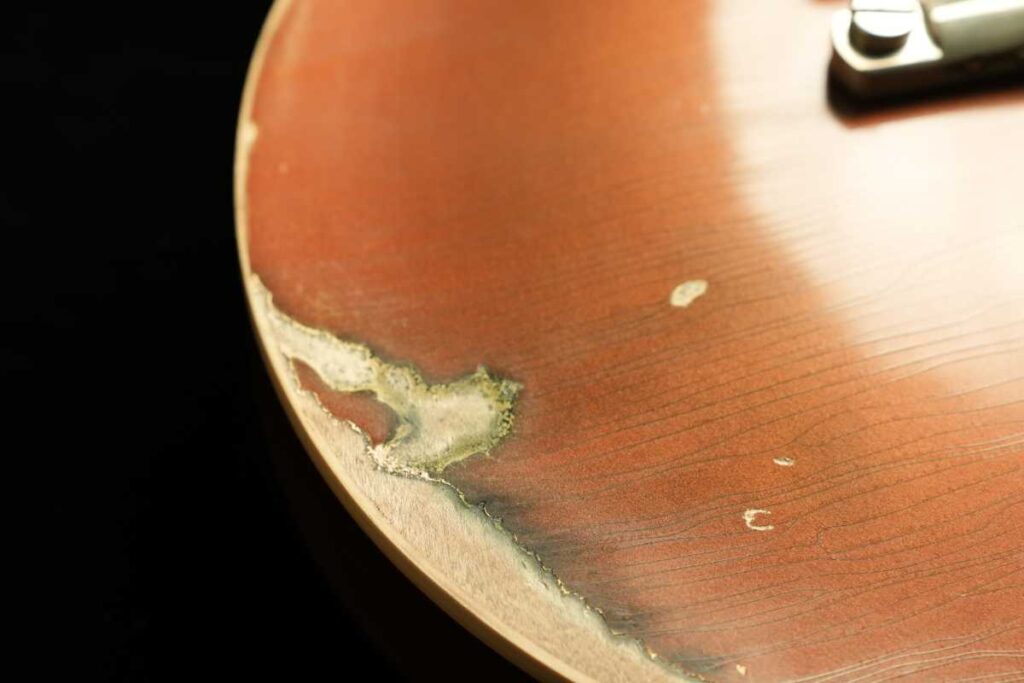 そして、ヴィンテージGoldtopの「金属の奥行き」は、単なる金色塗料ではなく、金属粉(一般にbronze/bronzing powderと呼ばれるもの)をニトロ系クリアに混ぜた層で生まれます。さらに、クリアが摩耗して金属粉が露出すると酸化が進み、緑に転ぶ個体がある——これが“緑青が出るGoldtopの根っこです。Premier Guitar