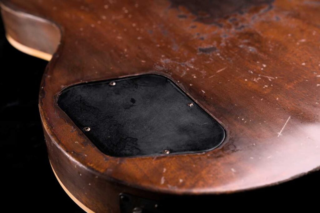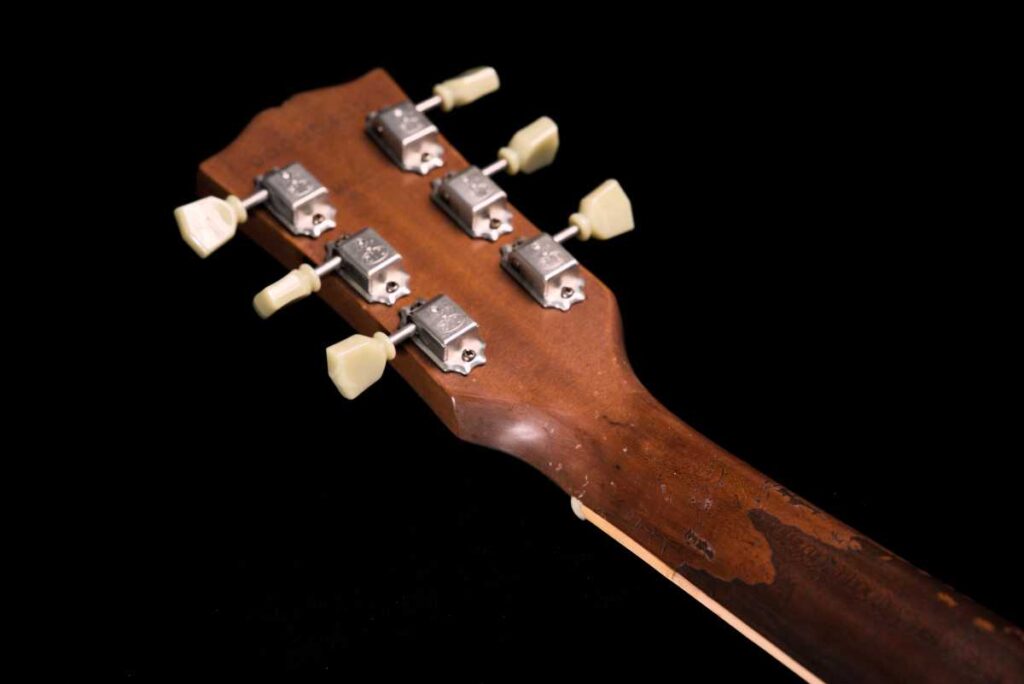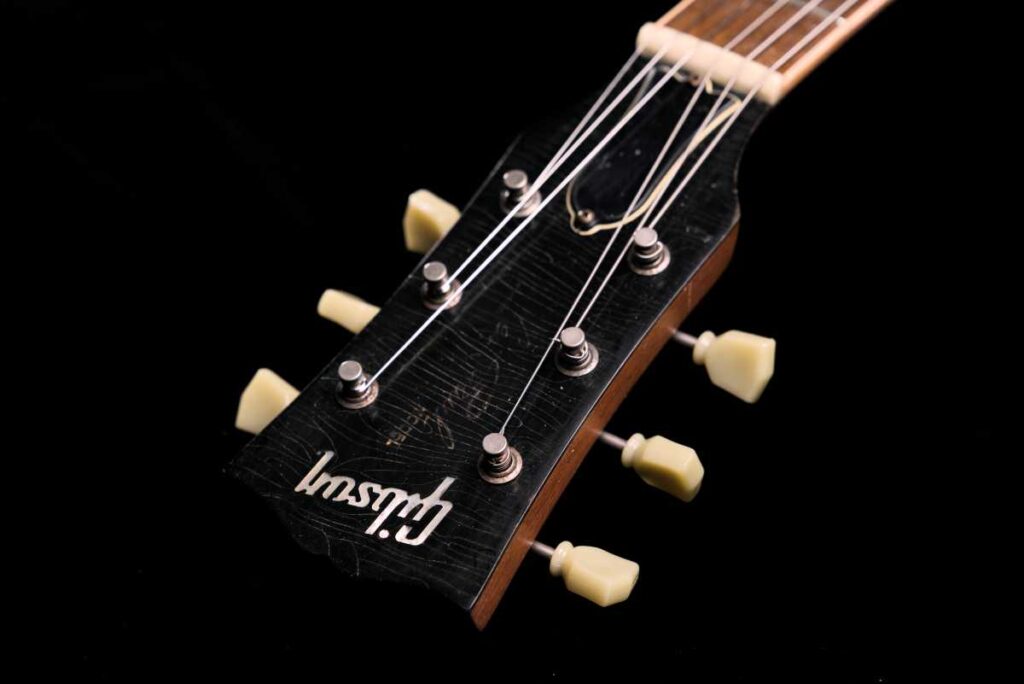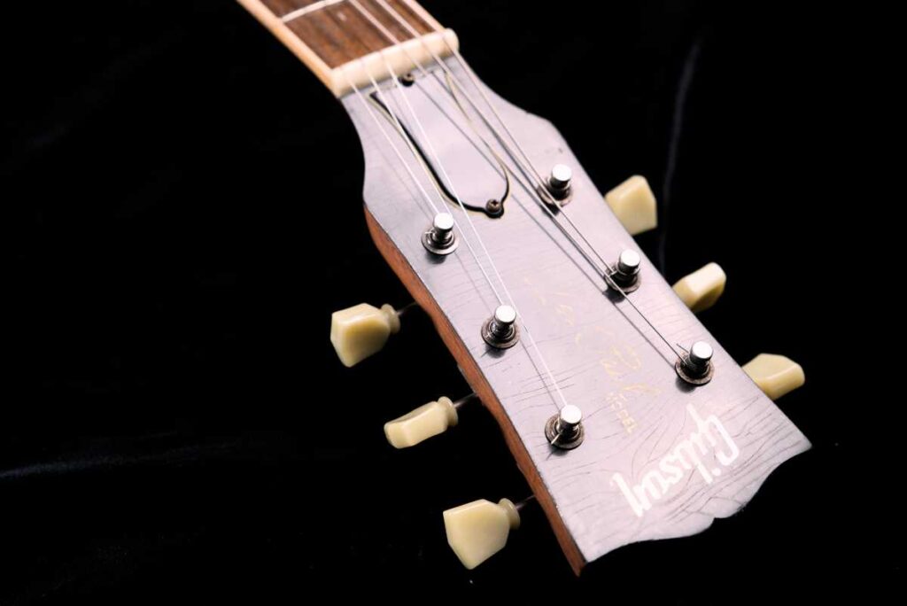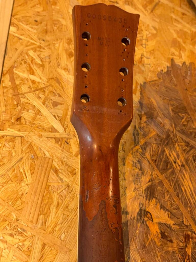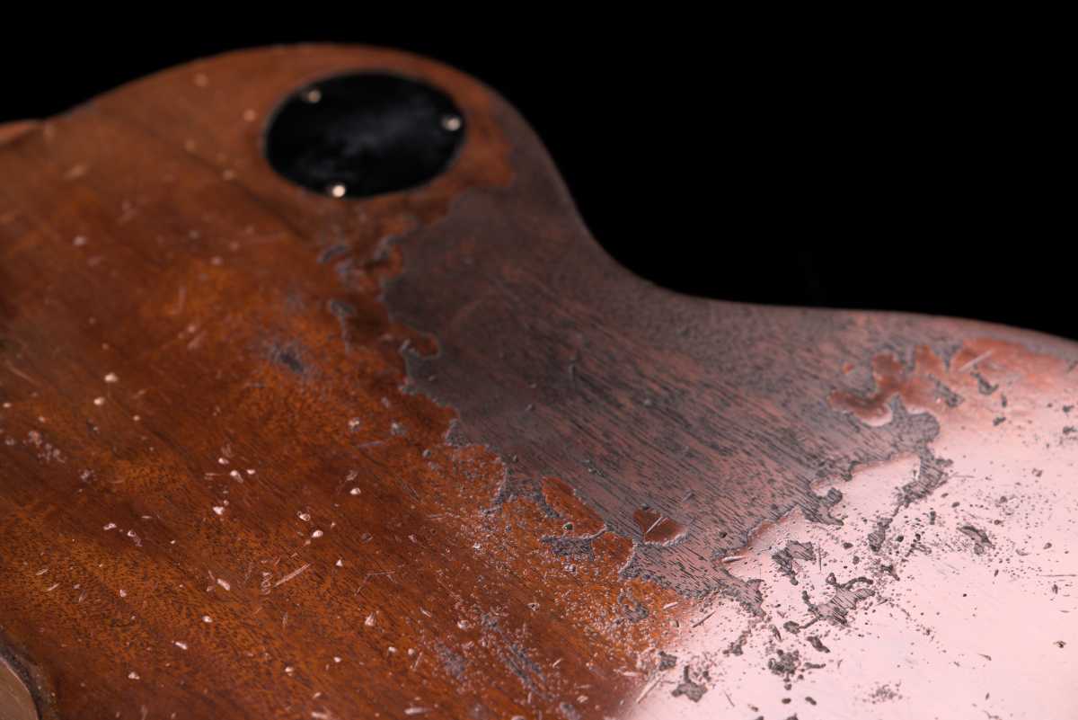 ビンテージ同様のステンシル塗装で Les Paul ロゴを再現し、最後にレリックで馴染ませています。
