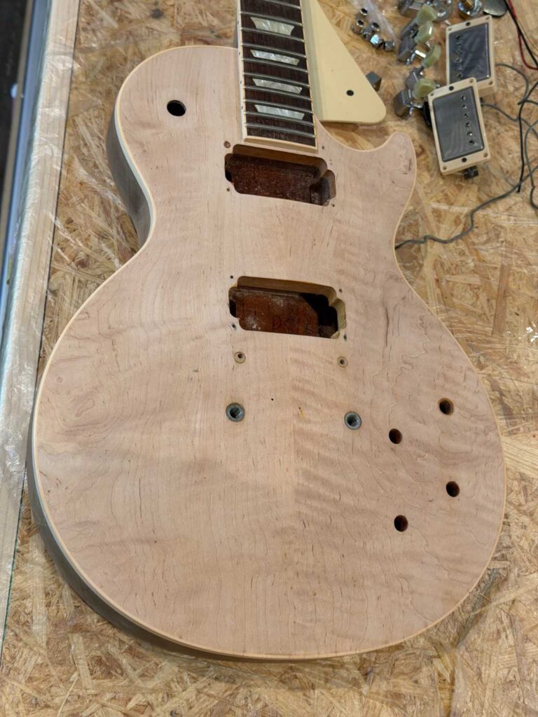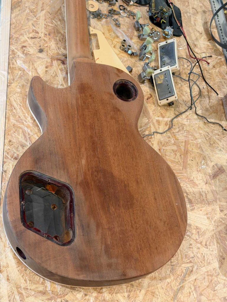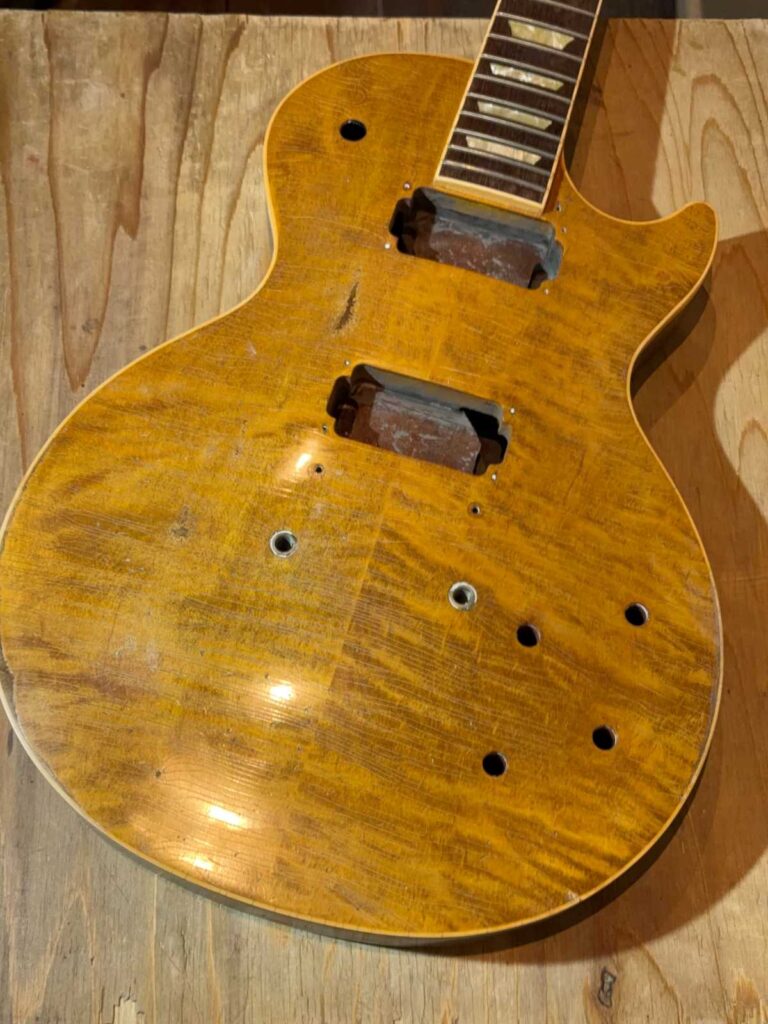 今回は Les Paul のリフィニッシュ/レリック加工として、1958〜60 Burstが褪色して、淡い黄〜レモンのグラデーションへ移り変わったように見える空気感を狙って製作しました。