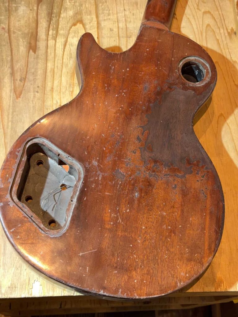 そこで、表面クリアを剥がし、クリア下の Les Paul ロゴを除去。