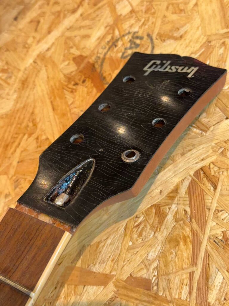 今回の個体は、ヘッドの突板にブラックの樹脂が使われていました。