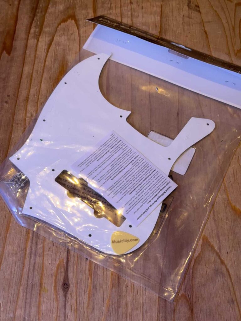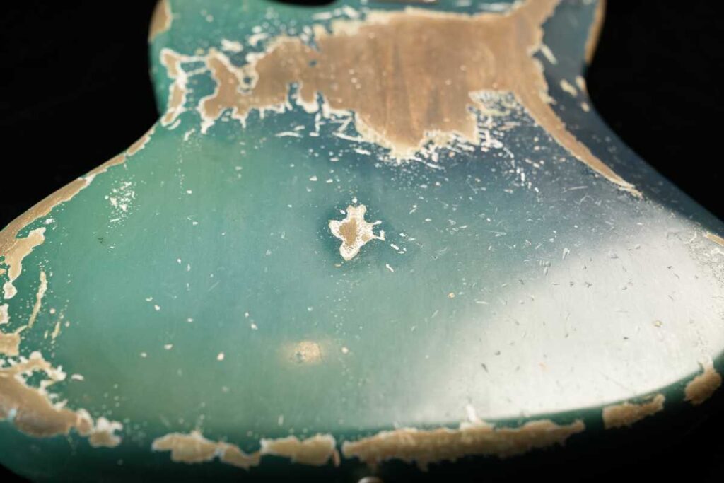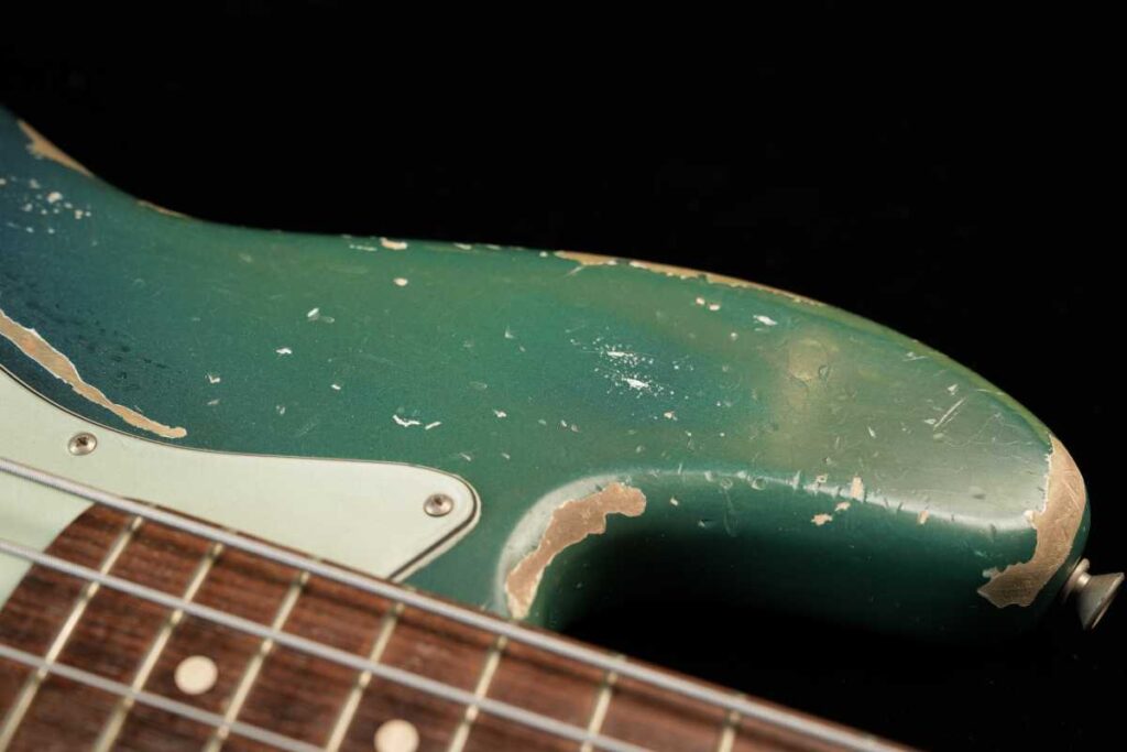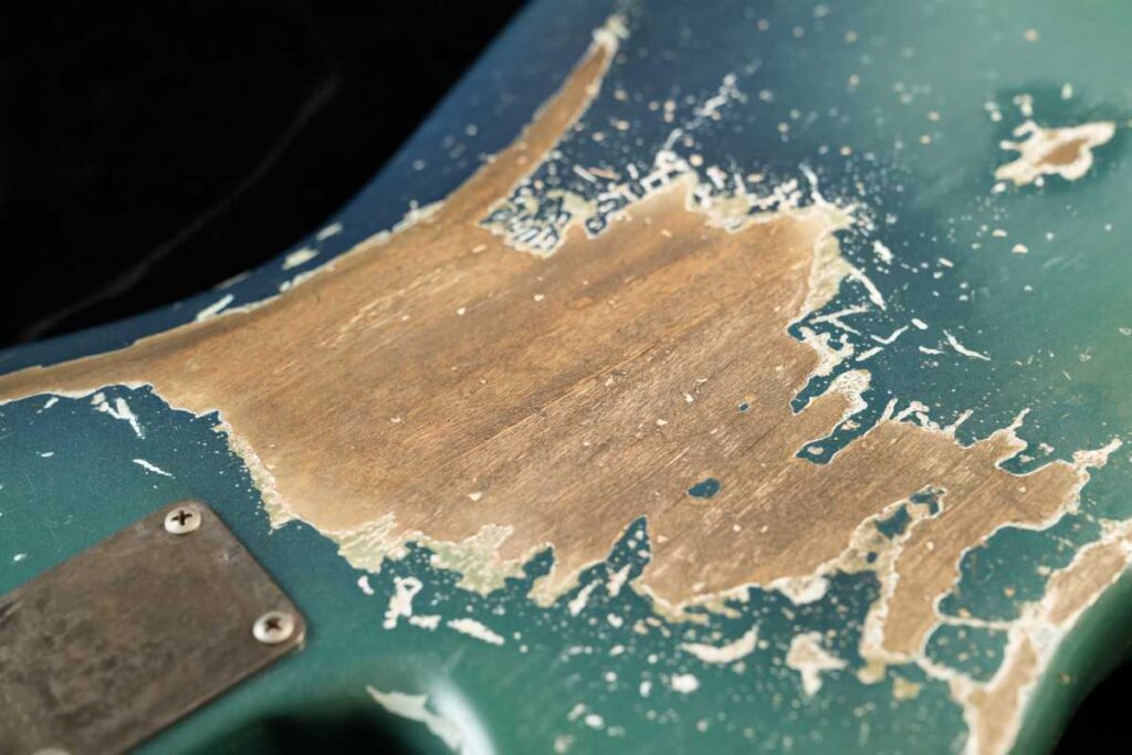 そこで今回は、白いピックガードをグリーンに染め、微妙なムラとグラデーションを作りました。背面も加工し、説得力を上げています。