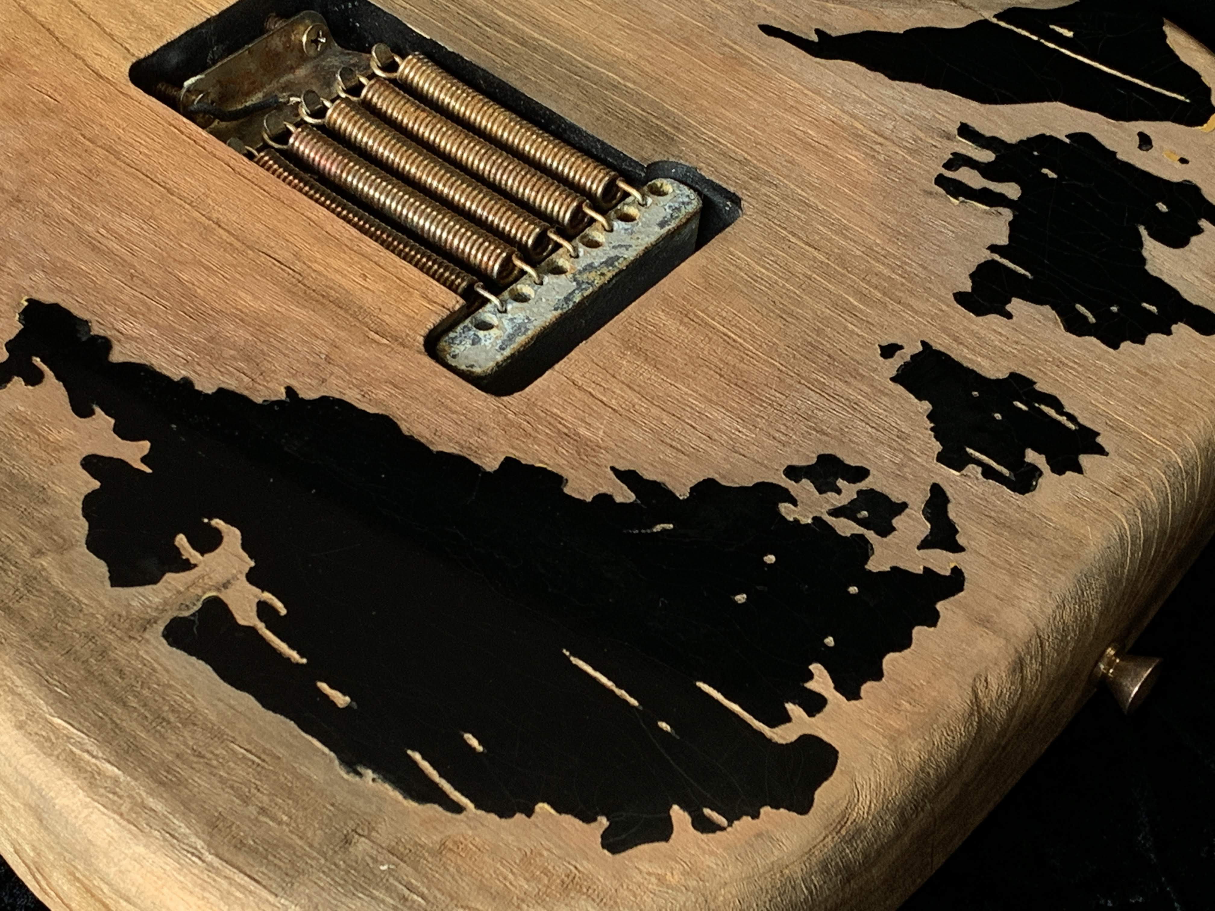 有名メーカーカスタムショップのマスタービルダーが手掛けるJohn Mayer ”Black One”モデルのデザインに限りなく寄せ、更に、独自の方法でギター本来の機能を損なわずにダメージを施しました。