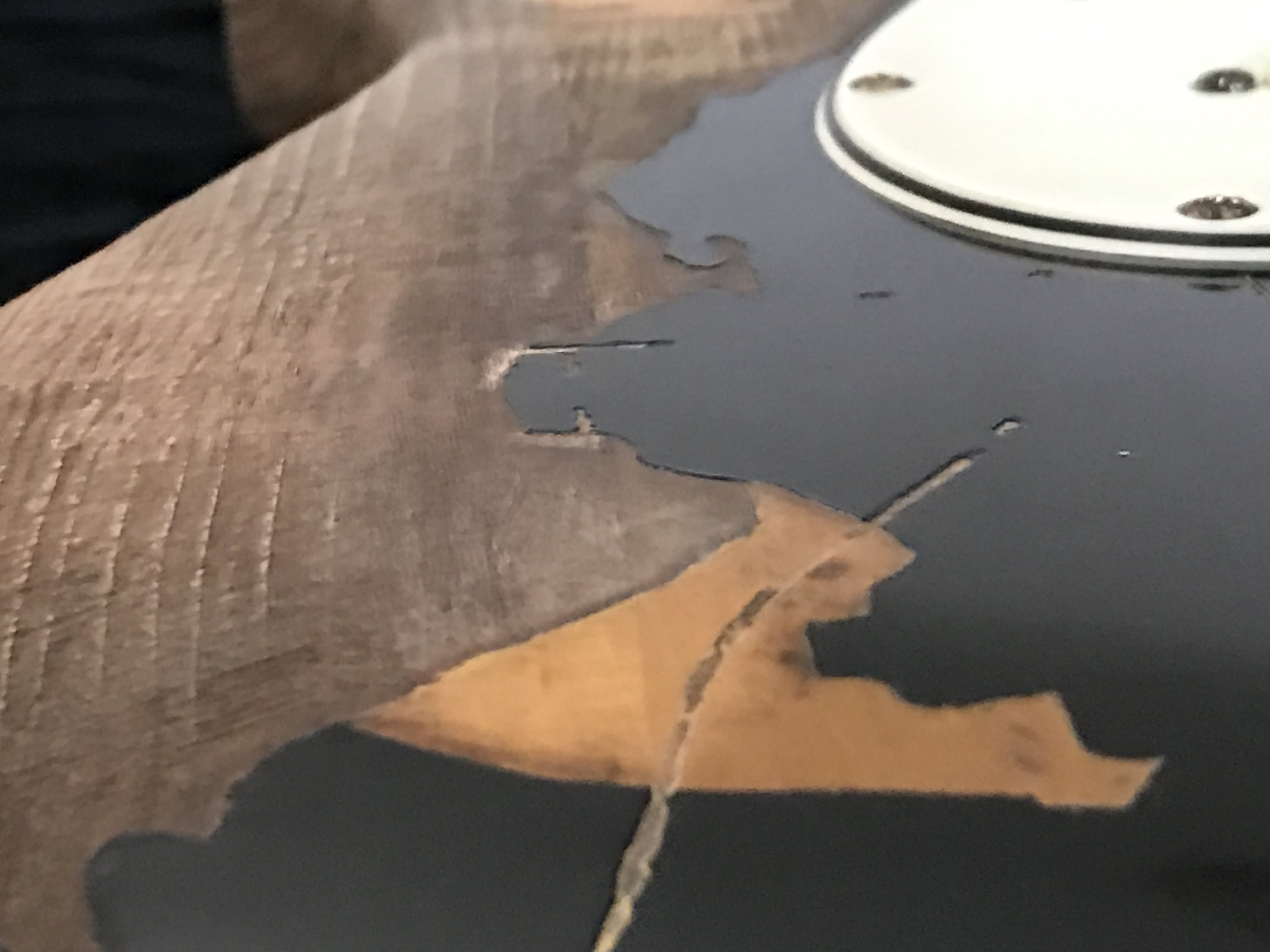 ピックガード、コントロールノブ、ピックアップカバーに経年による黄ばみを着色